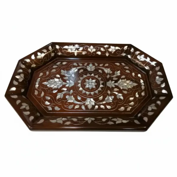 Hand-Crafted Octagonal Wooden Tray with Floral Mother-of-Pearl Inlay