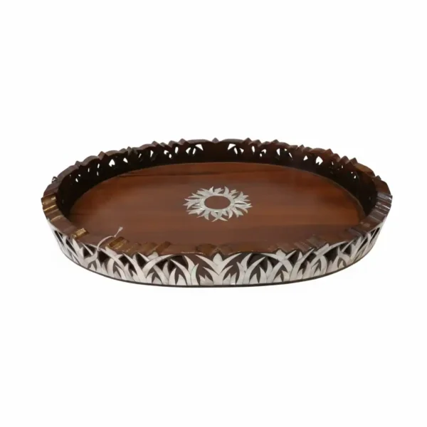 Oval Wooden Serving Tray with Sunburst Mother-of-Pearl Inlay & Carved Rim