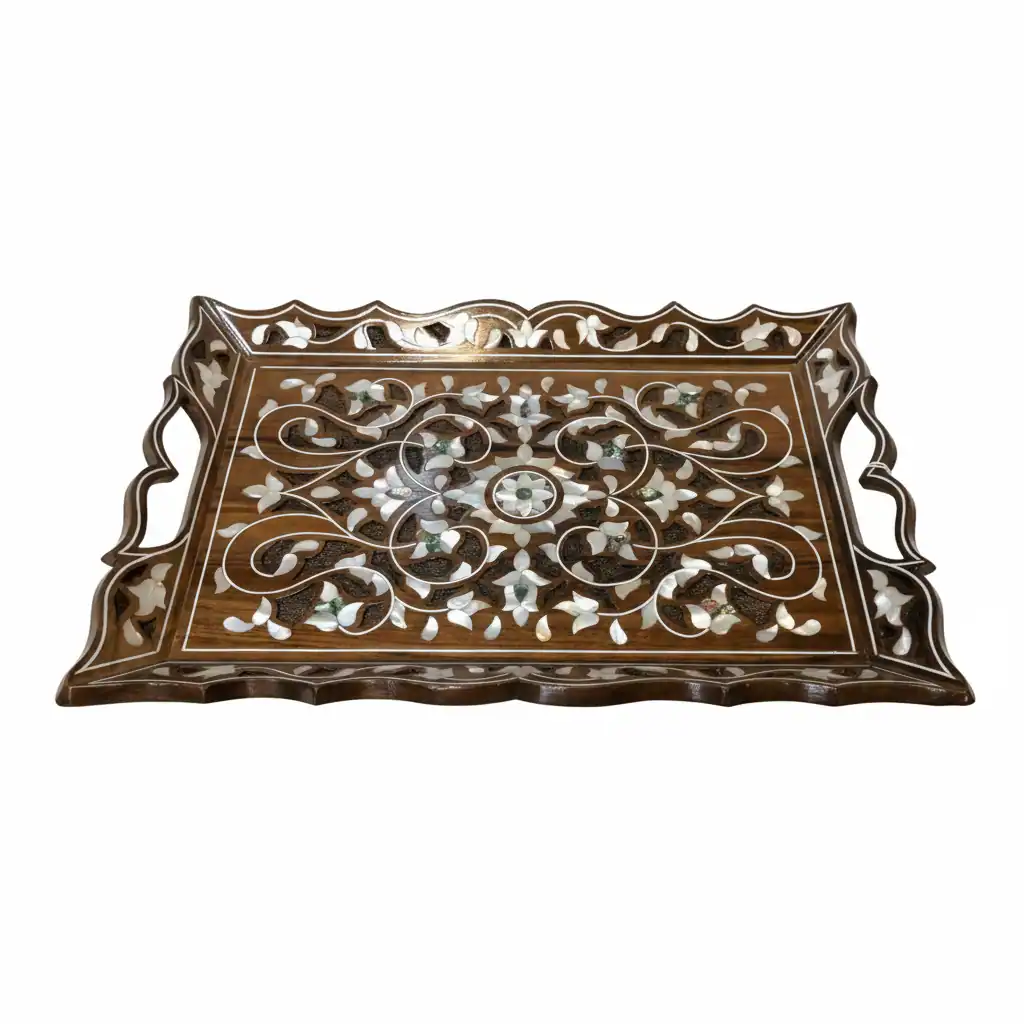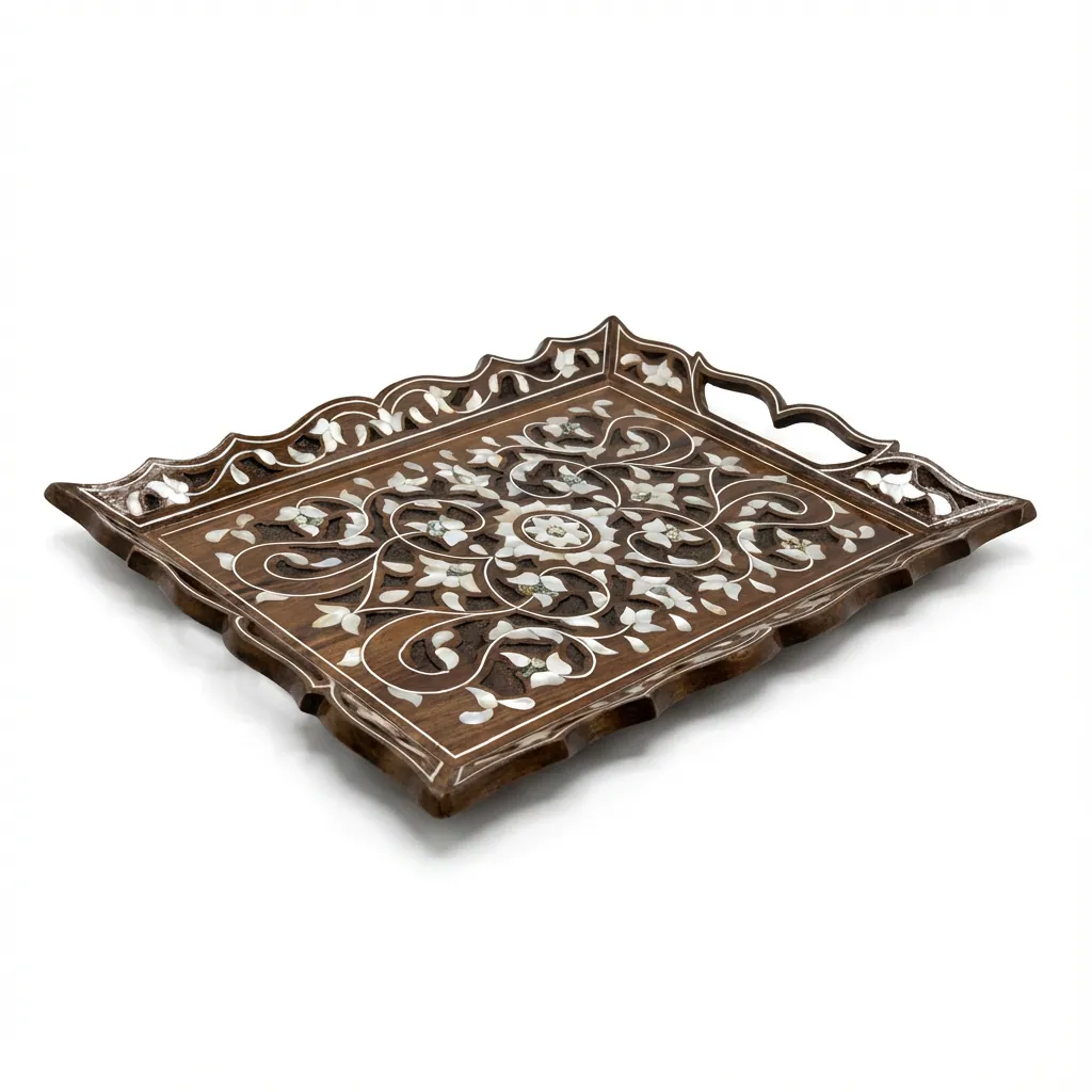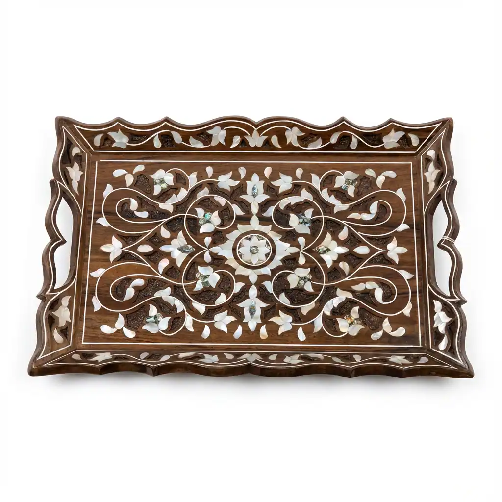 Handcrafted Luxury Wooden Serving Tray with Mother-of-Pearl Floral Inlay