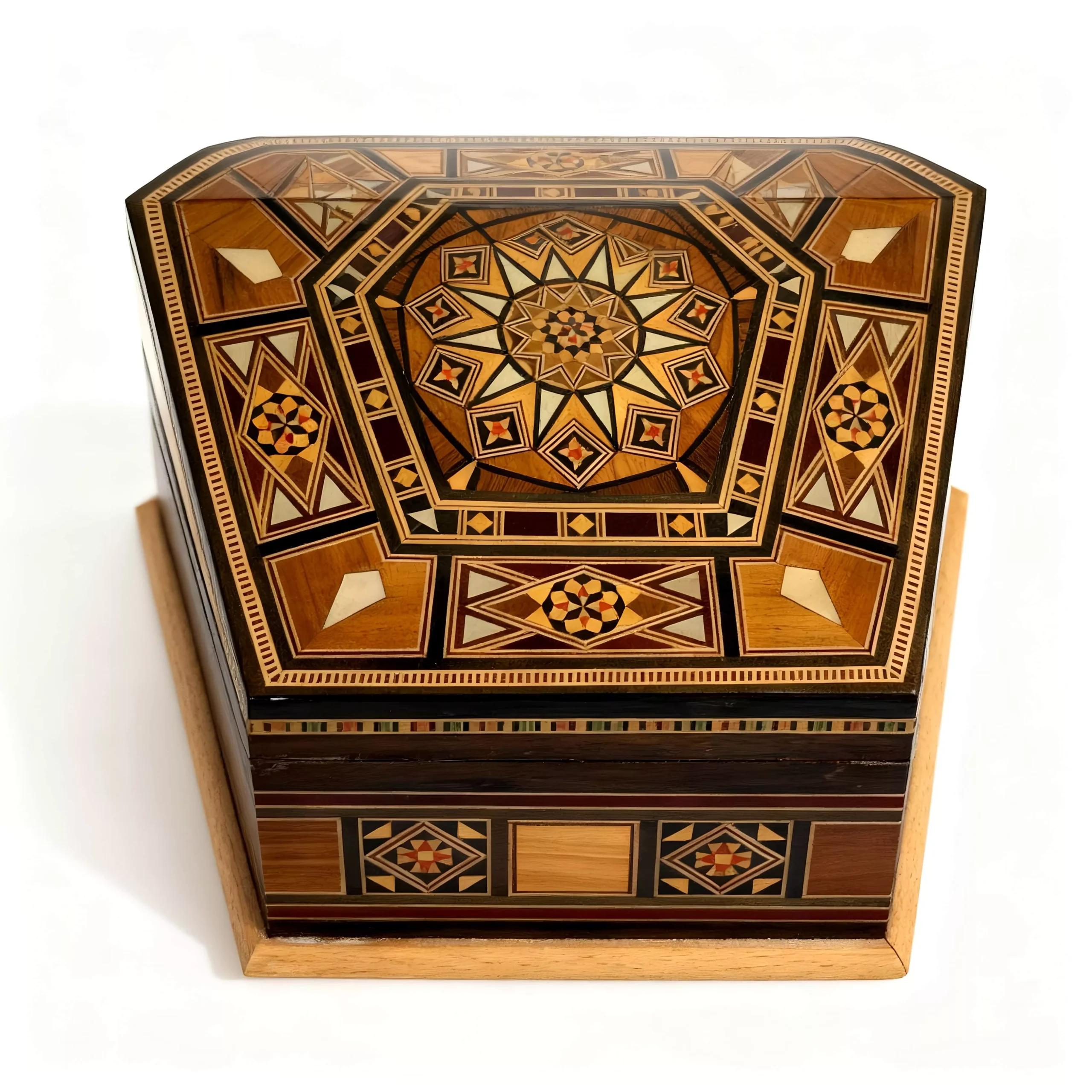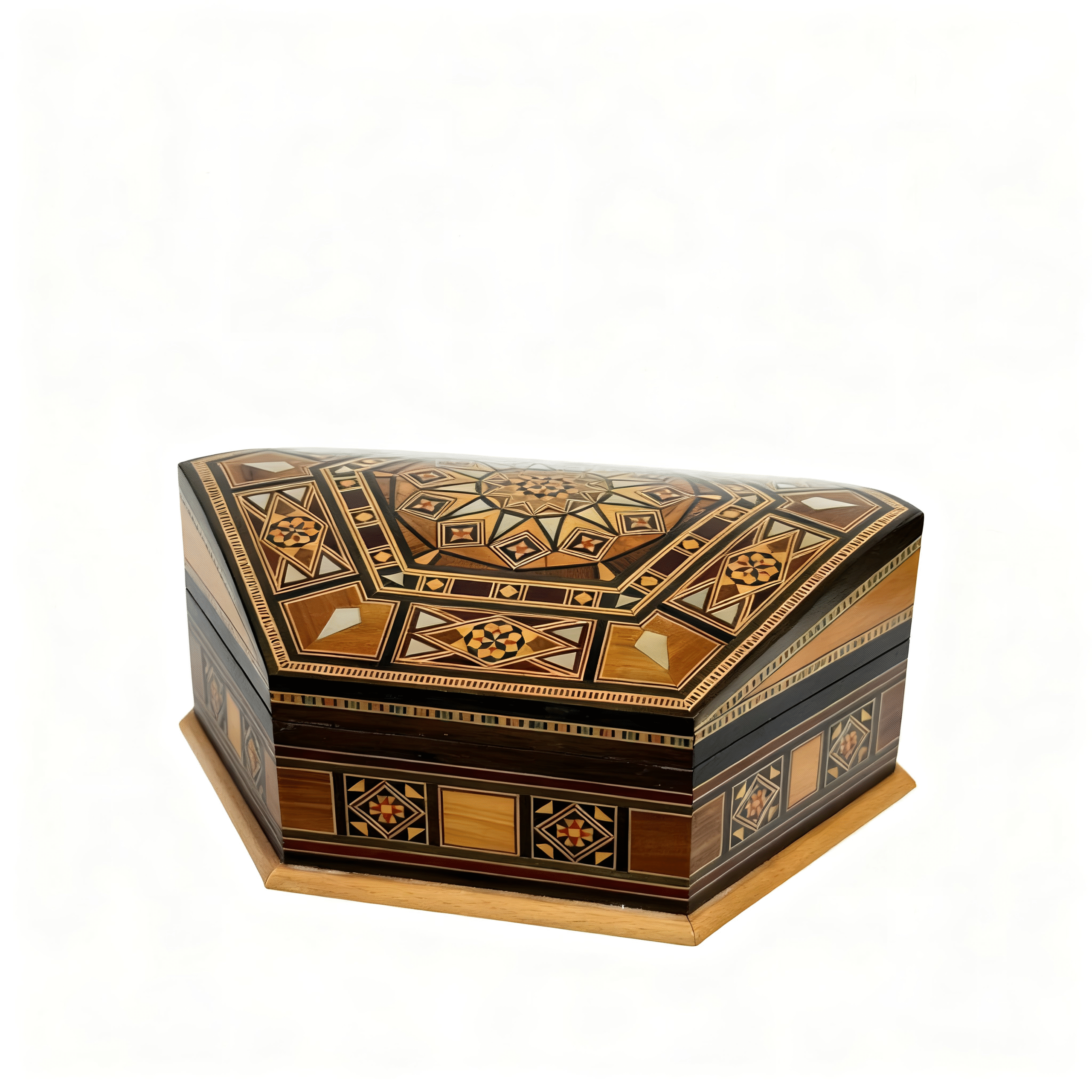 Experience the beauty of traditional craftsmanship with this handcrafted mosaic gift box, created with authentic wood inlay and natural mother-of-pearl. Every intricate geometric pattern is carefully placed by hand, showcasing artistry passed down through generations.