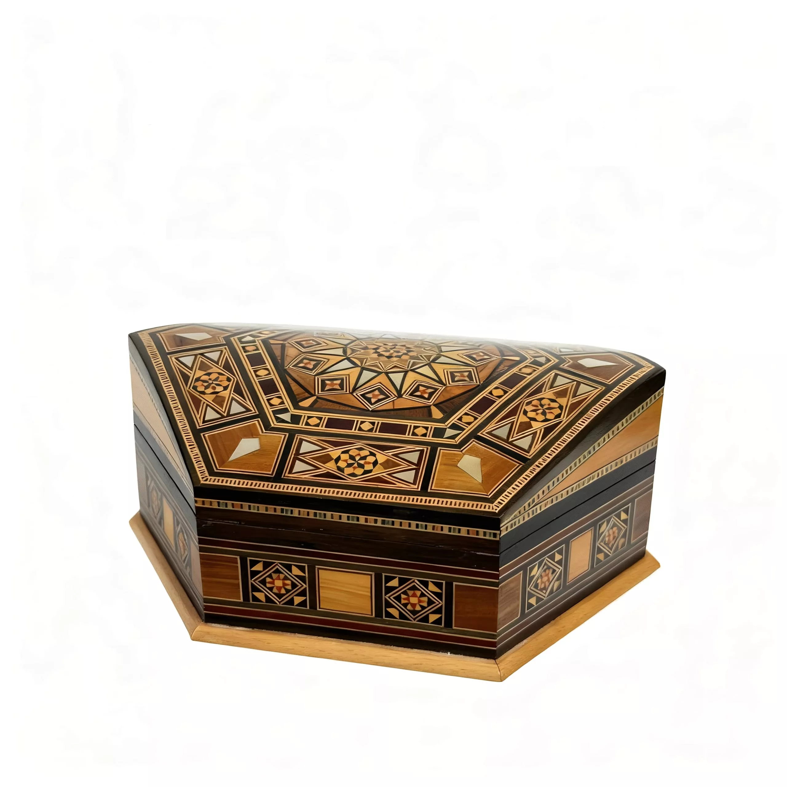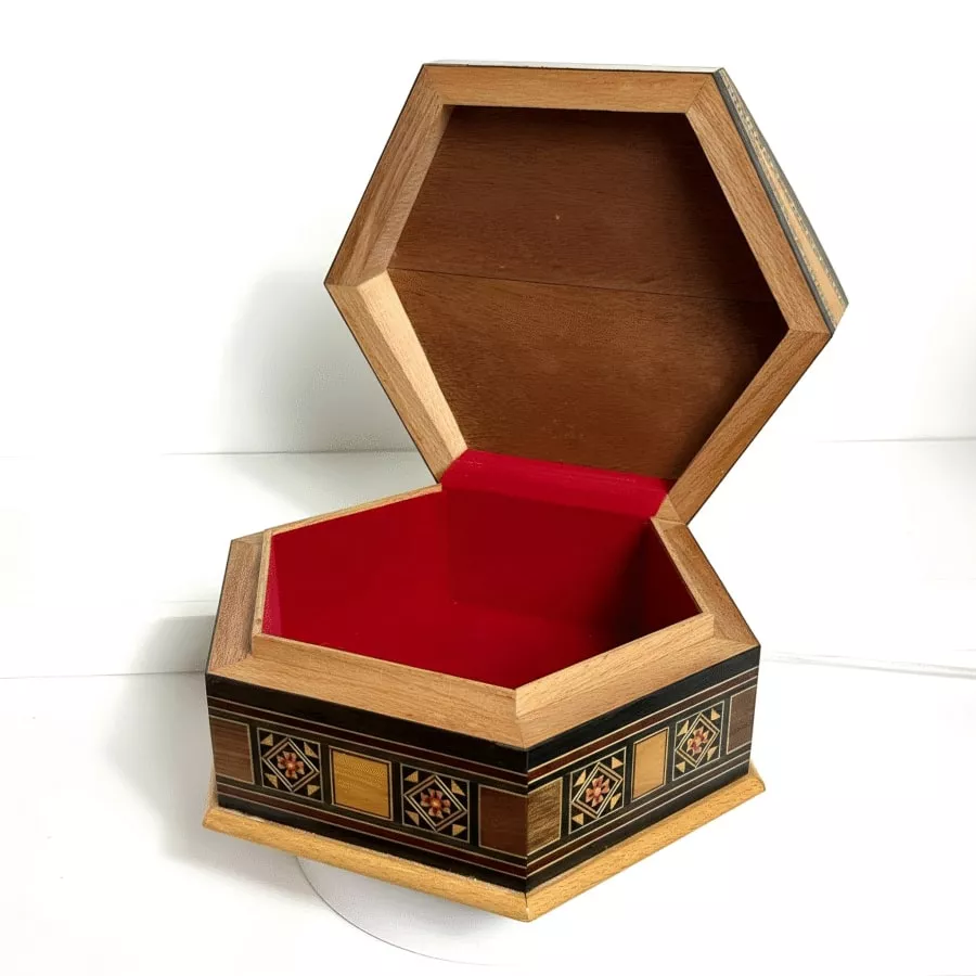 The hexagonal design gives it a unique, elegant presence — perfect as a luxury handcrafted mosaic gift box, a collector’s piece, or a sophisticated décor item for any home or office.