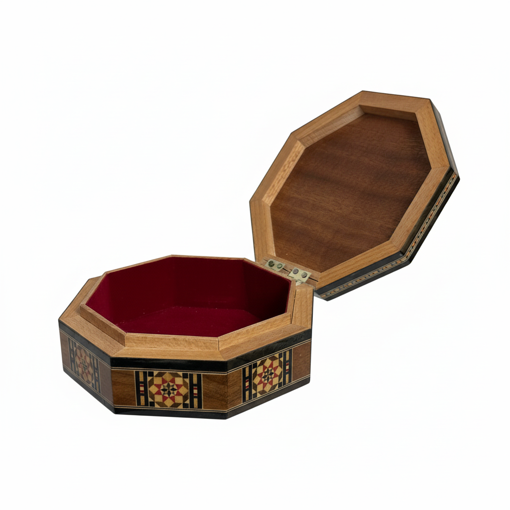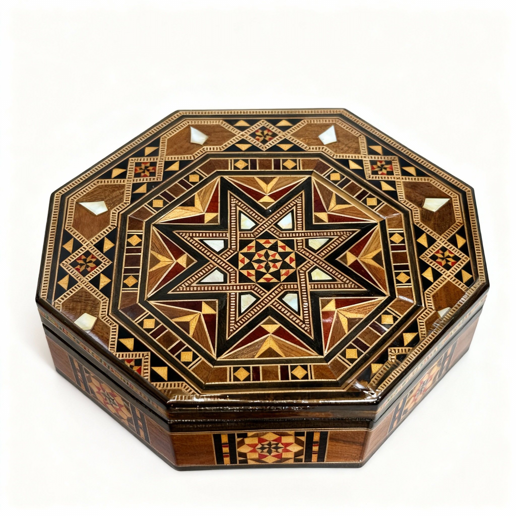Discover the beauty of traditional wood mosaic work with this stunning handcrafted octagonal mosaic wooden gift box. The lid features a mesmerizing geometric star design, created from countless individually cut pieces of walnut, olivewood, and beech. Each fragment is arranged with precision, forming a pattern that feels both modern and deeply rooted in classical craftsmanship.