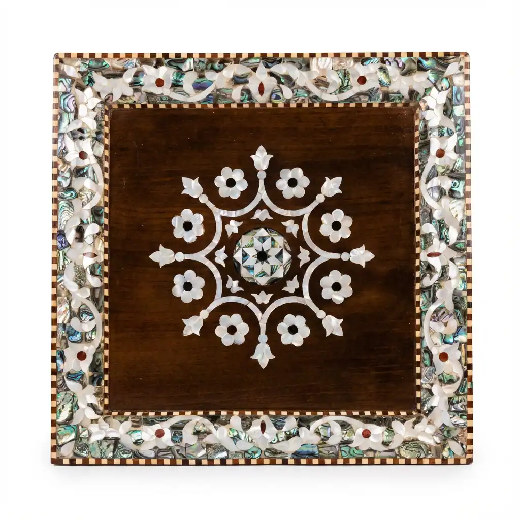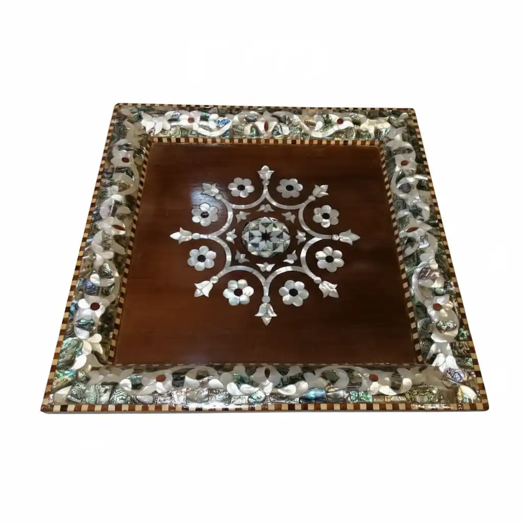 A beautifully handcrafted square serving tray featuring real mother-of-pearl inlay, abalone shell accents, and an elegant floral centerpiece. Perfect for serving, home décor, or displaying luxury items, this tray brings authentic artisan craftsmanship to any space.