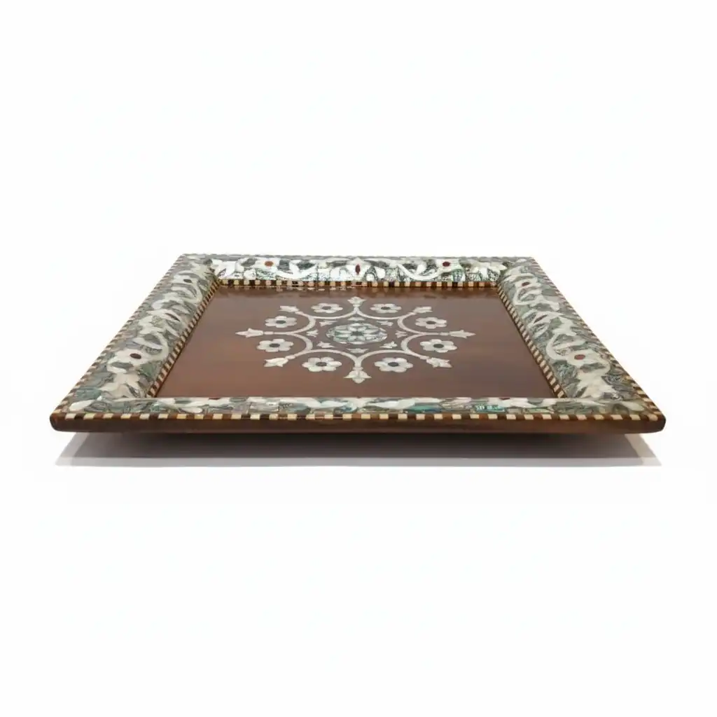 Handcrafted Square Serving Tray with Mother-of-Pearl Floral Inlay
