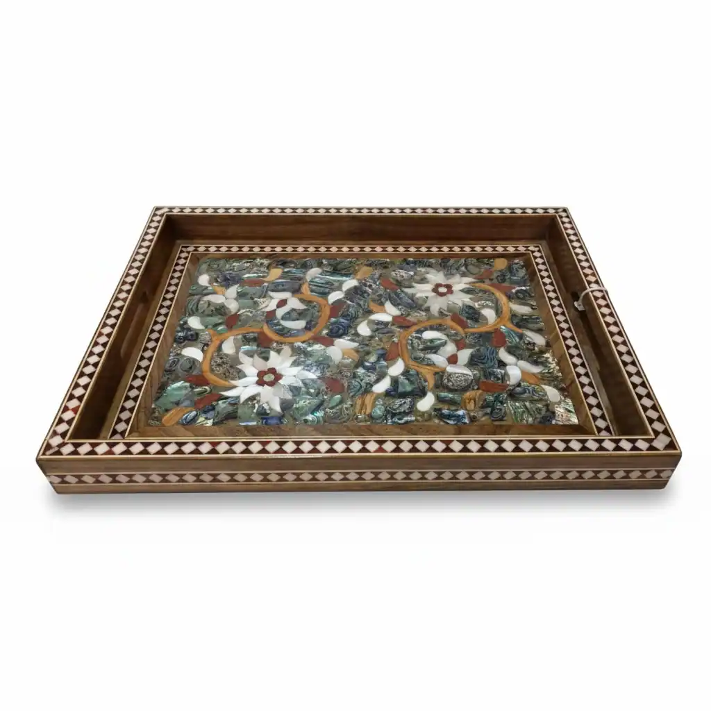 This handcrafted wooden serving tray showcases a breathtaking mosaic centerpiece made from polished mother-of-pearl, abalone, and warm-toned natural inlay pieces. The surface forms an intricate floral artwork filled with depth, shimmer, and extraordinary detail, giving the tray the appearance of a framed piece of art.